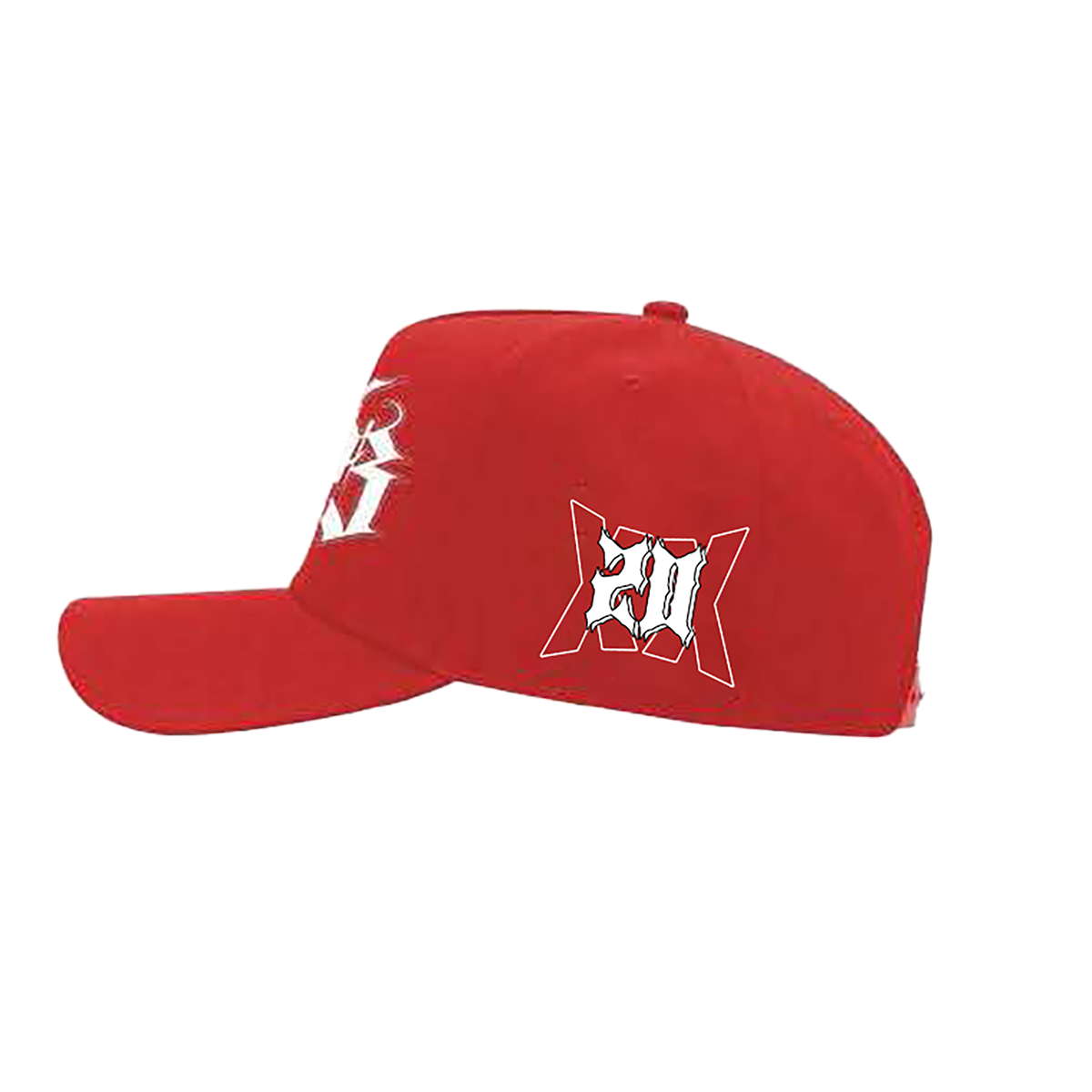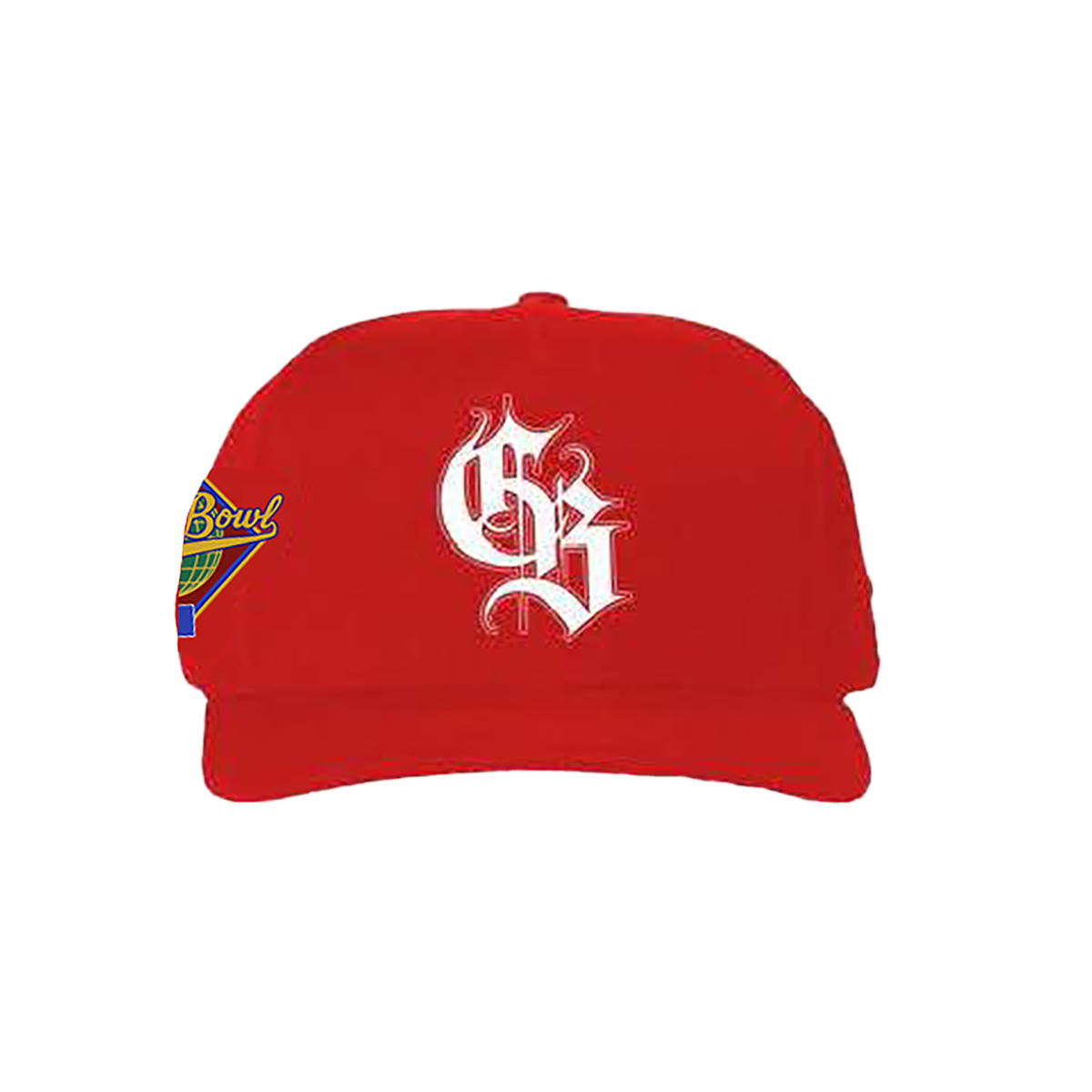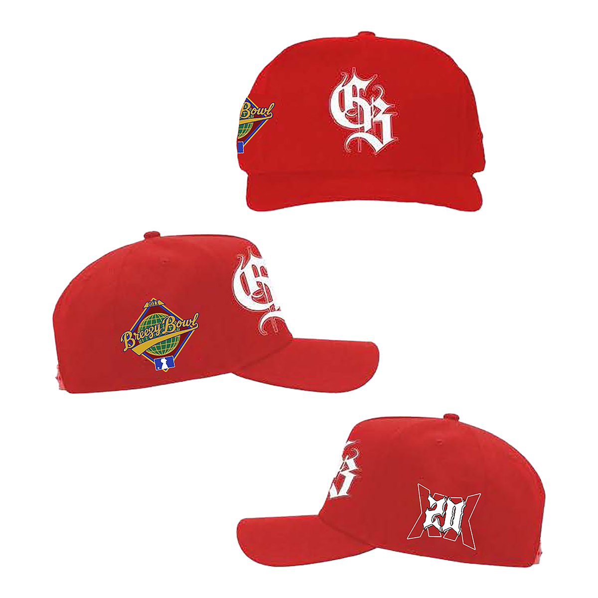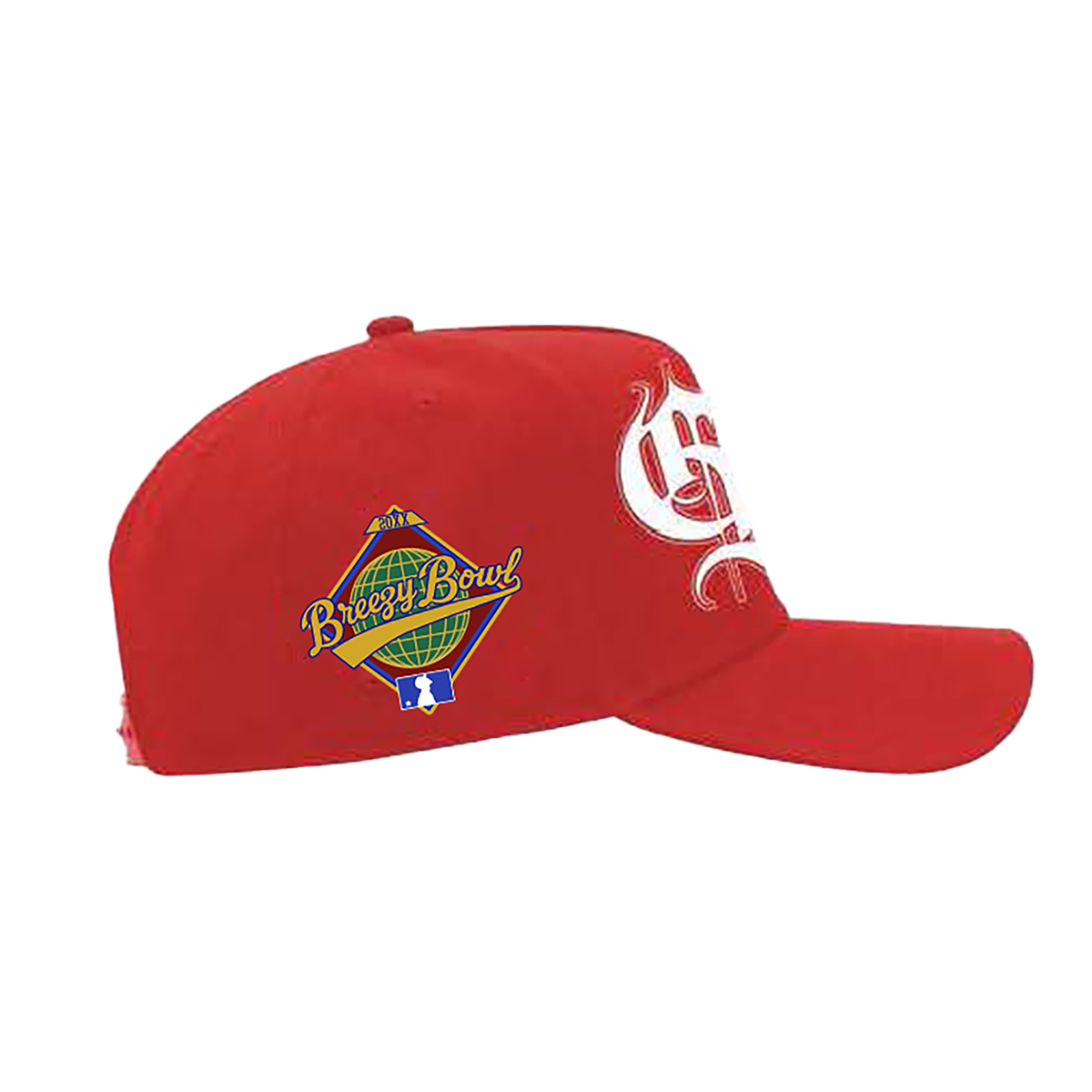 Red hat features Breezy Bowl XX designs on front and sides. Heavyweight acrylic pro-style snapback hat, heavy structure, mid-profile, embroidery front/back/side.